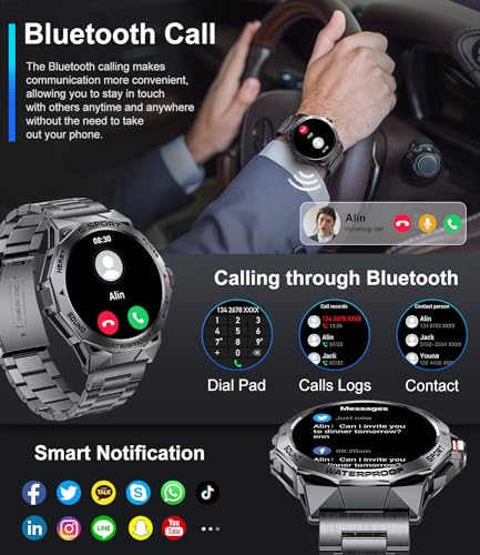 1.43'' AMOLED HD Touchscreen: The high-resolution 466*466 AMOLED display offers clear visuals, smooth operation, and an energy-efficient Always-On Display. Three Interchangeable Straps: Choose between stainless steel, silicone, and leather straps to match your style and occasion—from formal to casual. 400mAh Battery & 5ATM Waterproof: Enjoy up to 10 days of use on a single charge. With 5ATM waterproof, shockproof, and dustproof capabilities, it's perfect for any adventure. Bluetooth Calling & Smart Notifications: Stay connected with calls, messages, and app notifications. The built-in speaker and microphone ensure clear communication. 24/7 Health Tracker: Real-time monitoring of heart rate, sleep, calories, SpO2, and blood pressure. Track your health metrics over 7 to 30 days. 120+ Sport Modes: Includes running, hiking, cycling, skiing, and more. Biometric sensors measure heart rate, distance, calories burned, and training time. Multifunctional Features: AI voice assistant, music playback, weather forecast, calculator, alarm clock, stopwatch, remote trigger, and phone finder.